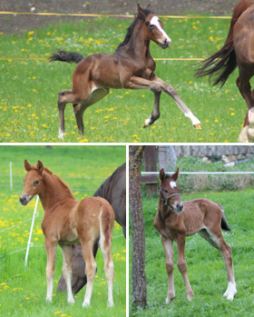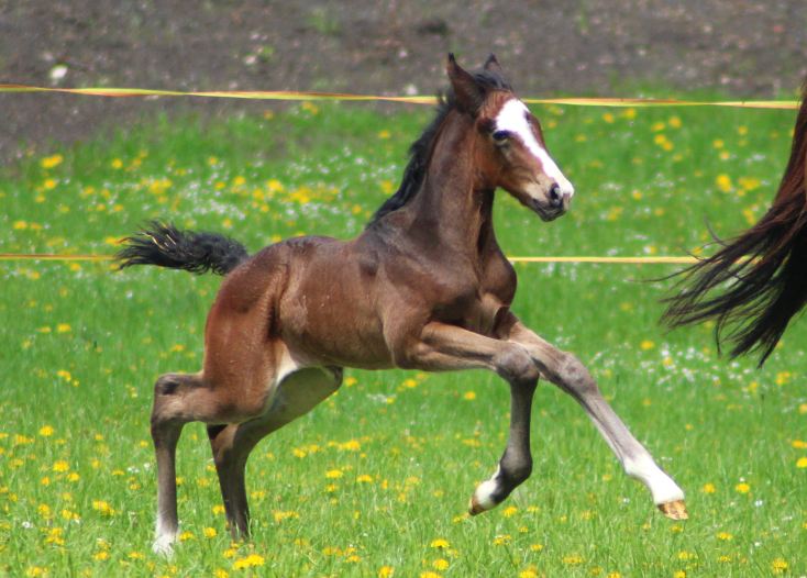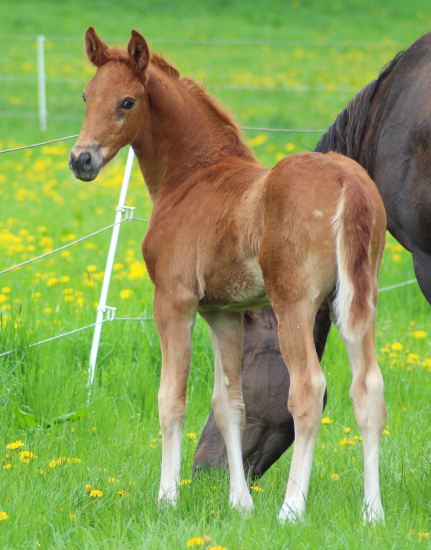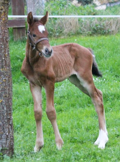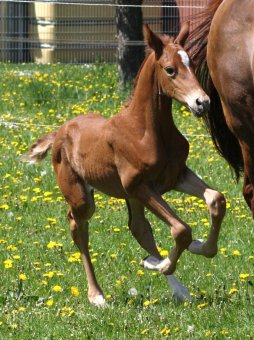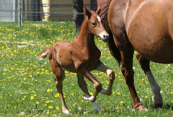 Der letzte kleine Strahlemann stammt vom Körungssieger Chambretto (Concetto x Chambertin) aus der Go Fine von Graf Grannus. Ein chicker Brauner mit einem hübschen Gesicht mit einem Stern auf der Stirn und ebenfalls hinten 2 weiße Beine. Caruso so hat ihn Theresa Müller, seine Besitzerin getauft. Wir wünschen Ihr viel Glück und daß er immer gesund bleibt.